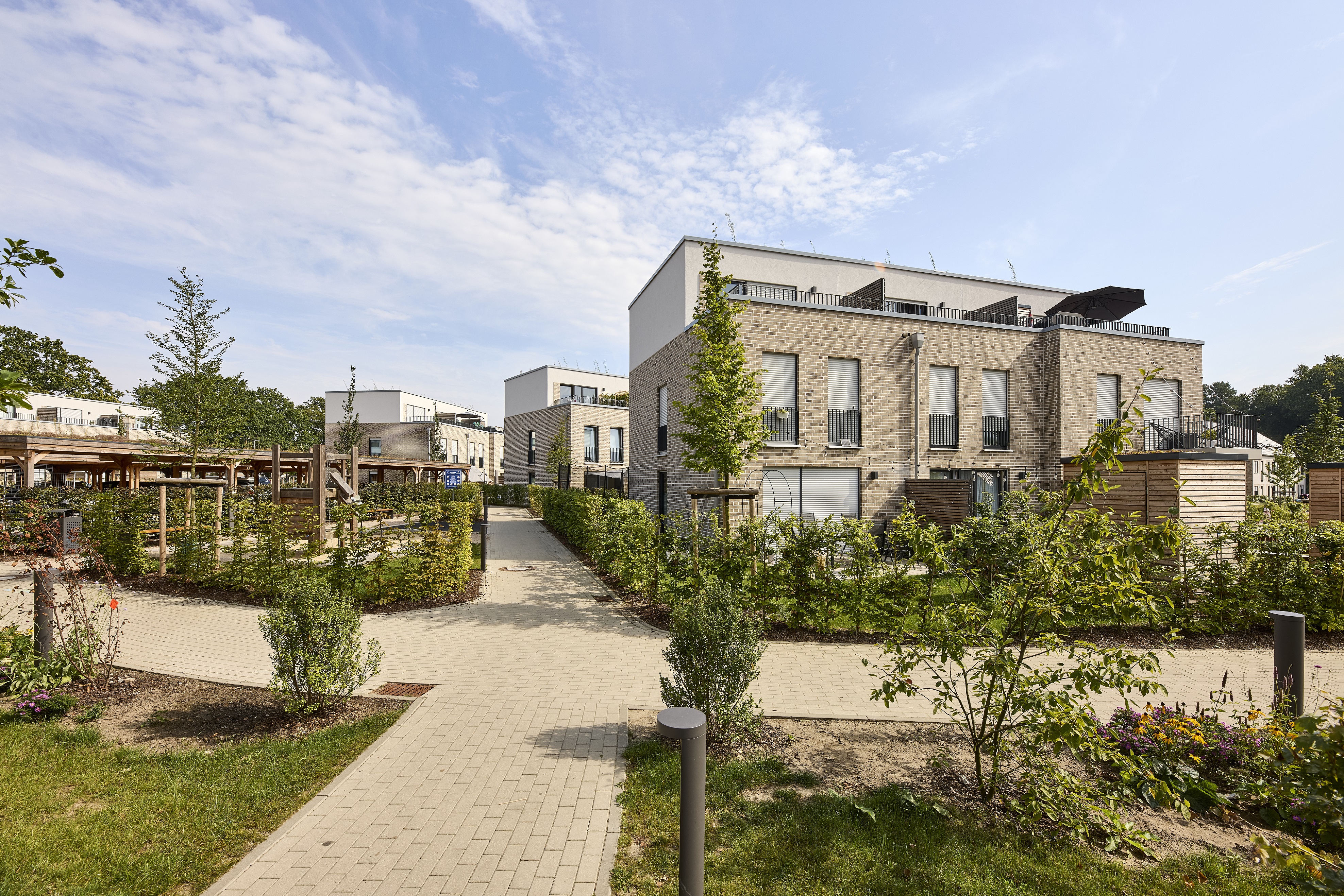 In unmittelbarer Nähe zum Öjendorfer See ist ein neues Wohnquartier entstanden. Zielsetzung war ein sozial und kulturell bunt gemischtes Quartier mit insgesamt etwa 650 Wohneinheiten.